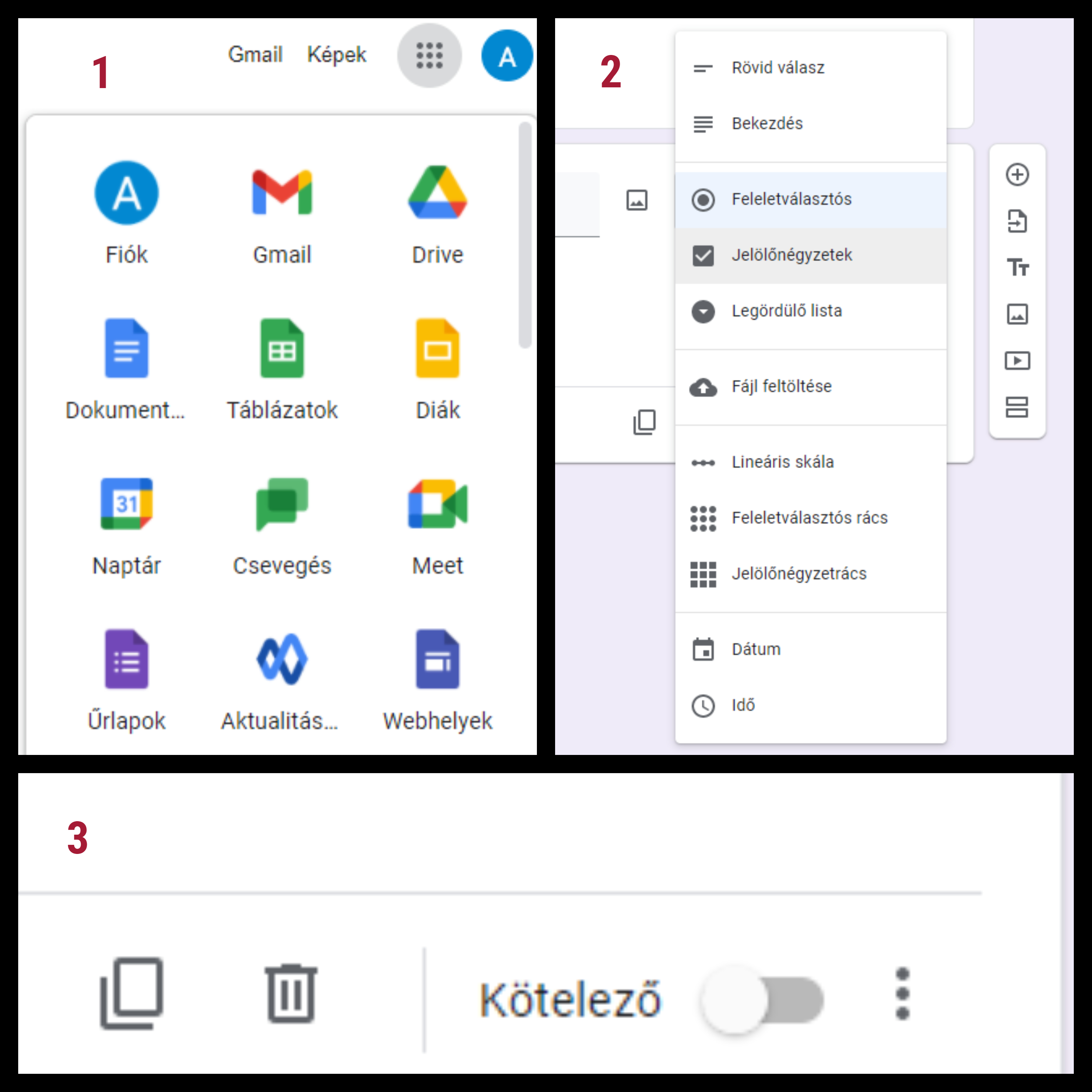 A Google kezdőlapon válasszuk a jobbra található lenyitható menüből az Űrlapokat (1-es kép, kattintható). Kattintsunk az új űrlap indítására. A kezdőképernyőn megjelenik az üres űrlap, ahol beírjuk a címet, megadjuk a leírást (jelezzük, hogy bizalmasan kezeljük az adatokat), az első kérdést, és kiválasztjuk a legördülő menüből, hogy milyen típusú választ adhatnak a kitöltők (2-es kép). Feleletválasztásnál írjuk be az opciókat a kérdés alatt. Új kérdés a plusz ikonra kattintva adható hozzá, a Panel gom pedig szakaszokra bontja az űrlapot. A Kötelező csúszkáján jelölhetjük ki, hogy kell-e választ adni (3-as kép).