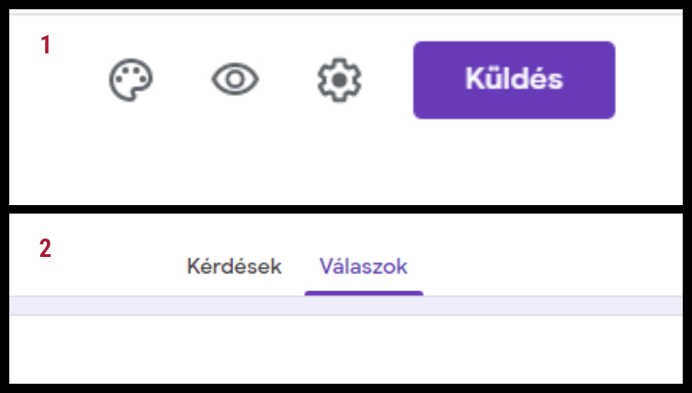 A képikonra kattintva a kérdésekhez, válaszokhoz mellékelhetünk képet. A fenti menü (1-es kép) palettájával személyre szabható az űrlap. Beállíthatunk fejlécet (érdemes a szervezet logóját vagy az űrlap témájához és a szervezethez kapcsolódó képet választani), témaszínt és háttérszínt. A paletta mellett a szemikonra kattintva láthatjuk, hogy a kitöltőknek miként jelenik meg az űrlap. A „Küldés” segítségével szabályozhatjuk a kitöltők körét (bárki vagy csak a meghívottak). A saját Drive-unkból bármikor elérhetjük a kérdőívet. Miután megnyitjuk, a Válaszokra (2-es kép) kattintva láthatjuk az eredményeket.